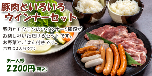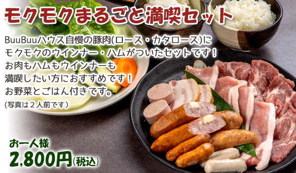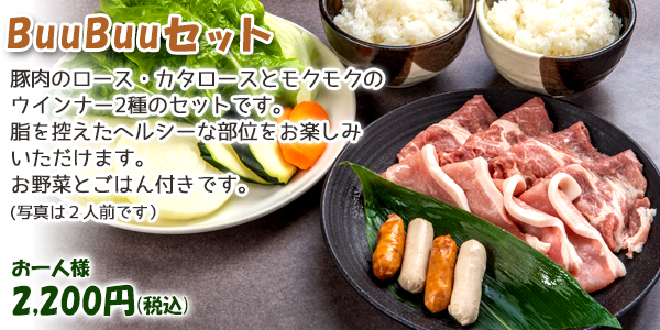 | セット内容 | あらびきウインナー 皮なしホワイトウィンナー 豚カタロース 約80g 豚ロース 約80g 塩だれ BuuBuuハウスのたれ 野菜盛 白米 |