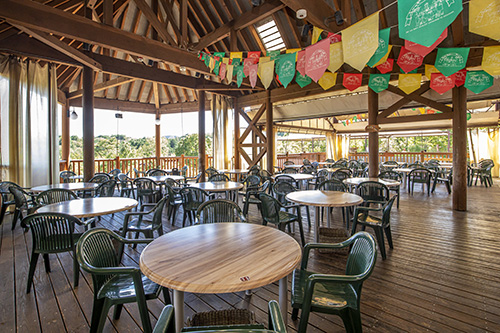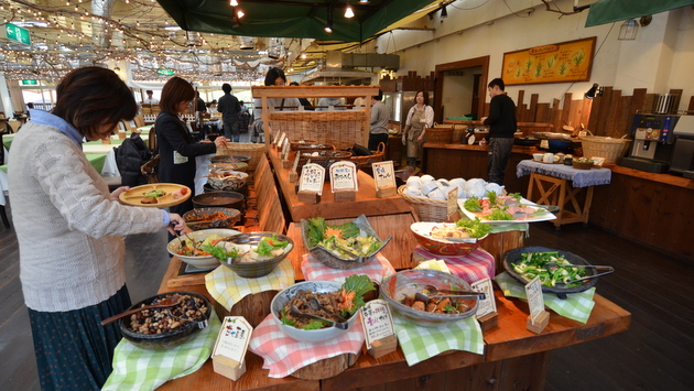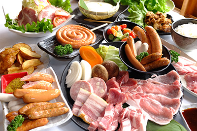 モクモクでつくっているハム・ソーセージ、パン、お野菜、牛乳などが味わえる、バイキング形式の朝食となります。