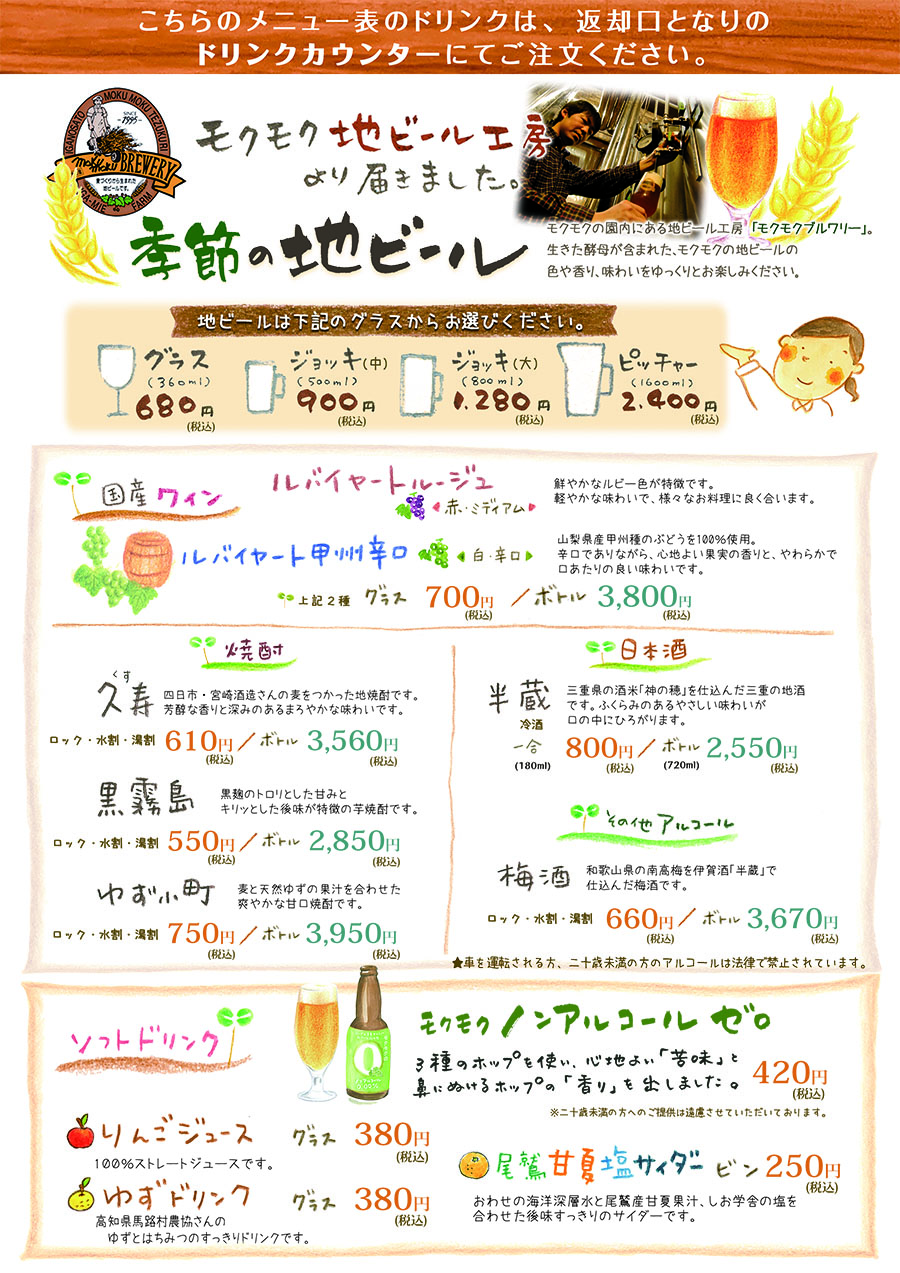 下記のドリンクメニューをご確認ください。
