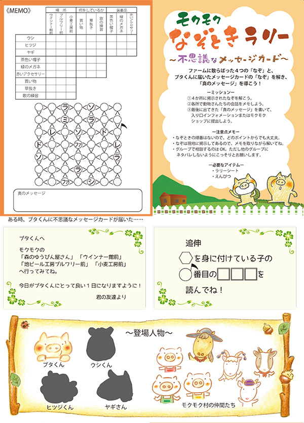 ファームに散らばった4つの「なぞ」と 「ぶたさんのメッセージカードのなぞ」を解き、 真のメッセージを探りあてよう!